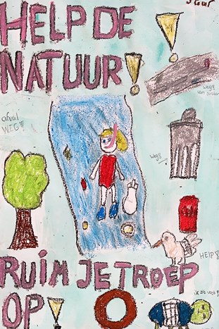 Een groep kinderen uit leerjaar 7 hebben prachtige tekeningen gemaakt van krijt en ecoline. We doen mee aan een superleuk tekenwedstrijd van de gemeente Den Helder. We moesten een poster ontwerpen om zwerfafval tegen te gaan. De vier mooiste tekeningen uit Den Helder worden als sandwichbord door de hele stad opgehangen. We moesten goed opletten dat je duidelijke vormen en tekst, zodat iedereen die langs rijdt meteen weet waar het over gaat! Het was heel leuk om te doen! We hopen dat we winnen.