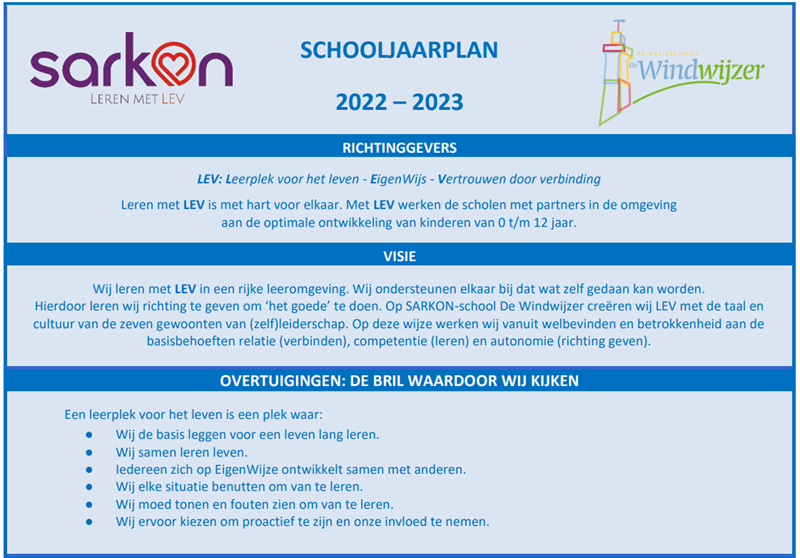 Sarkonscholen en het schoolbestuur werken samen aan de goede kwaliteit van het onderwijs. Door auditteams, schoolbesprekingen en collegiale consultaties wordt de kwaliteit op de Sarkonscholen getoetst aan de uitgangspunten van ’Leren met LEV’ en de wettelijke kaders. Op De Windwijzer is…